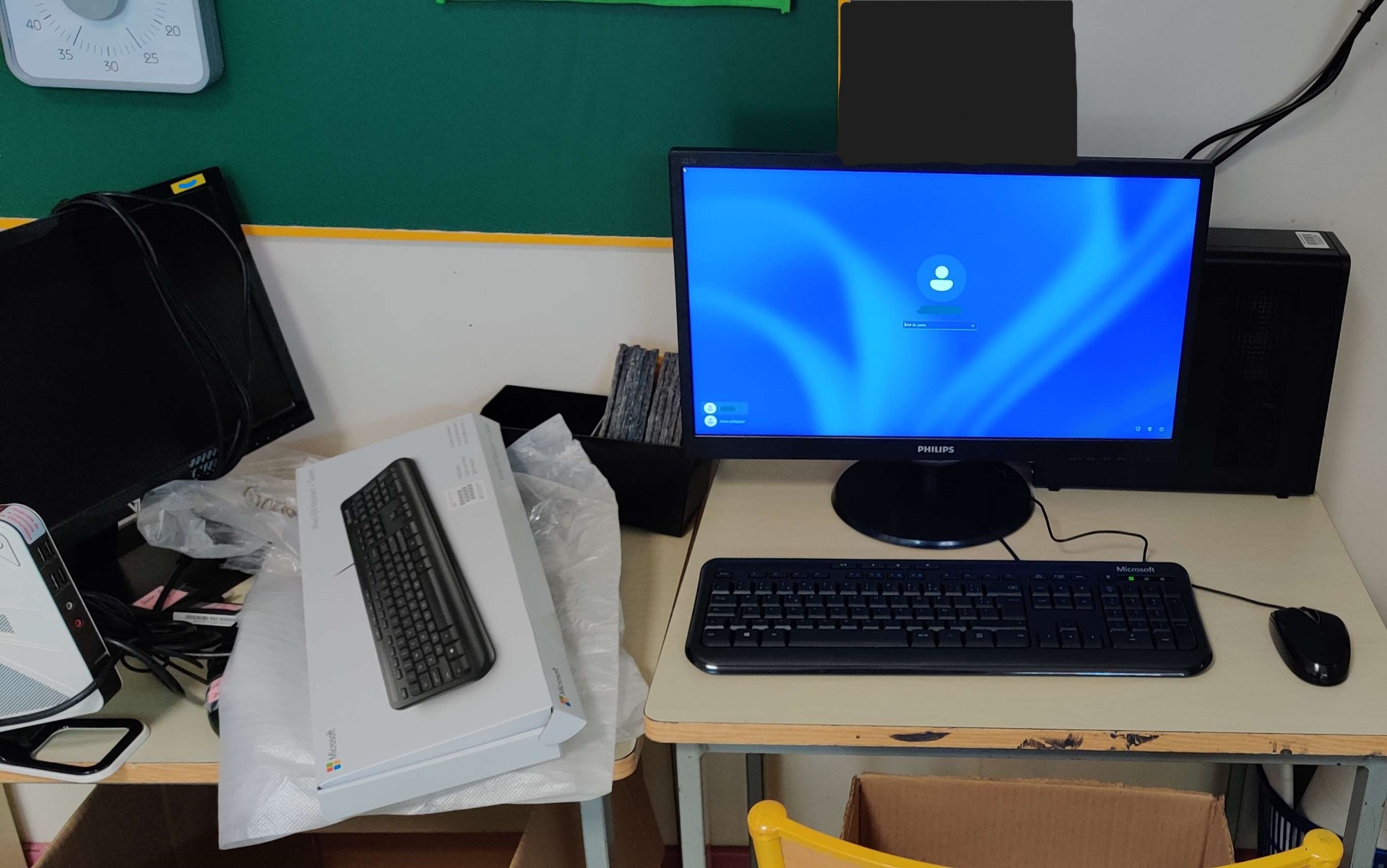 Sur cette photo, nous sommes dans le groupe scolaire n°1. Le nouvel ordinateur installé avec ses périphériques sur la droite, l'ancien matériel à gauche.
