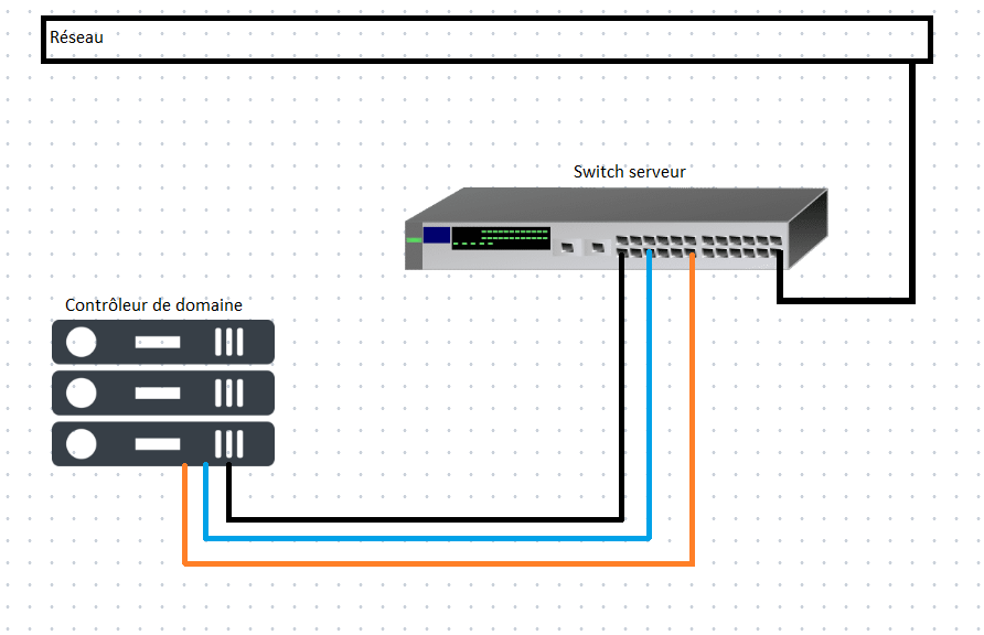 On raccorde donc le contrôleur de domaine en suivant ce schéma en s'assurant qu'après la configuration du switch serveur, que tous les liens soient actifs (en regardant si les ports s'allument.)